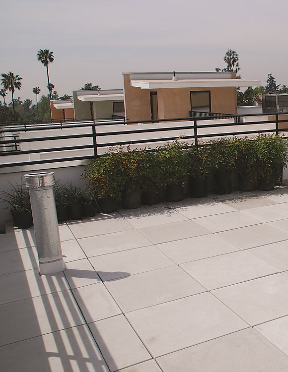 Lightweight Roof Pavers were invented to follow the natural slope of the roof and where an existing roof or new roof construction requires a lighter load. Cast with 1" of concrete laminated to a 1 1/2" of expanded polystyrene foam these pavers have the look and feel of a full weight paver yet weigh in at roughly half the load.