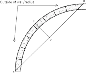 2. From the middle of Line A to B, measure up from the line to the outside of the wall (Height of arc), this is C to D; enter below.